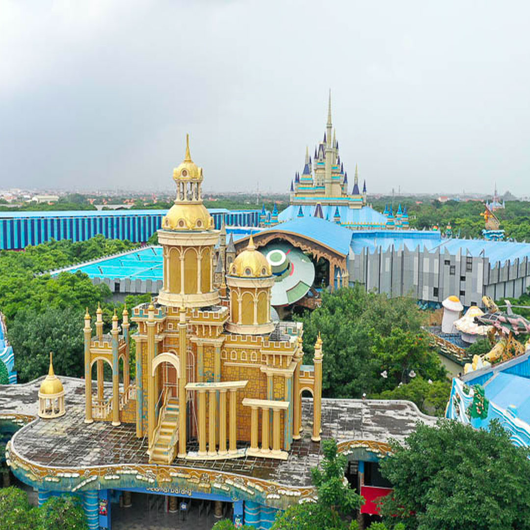 Atlantis Land di Kenjeran, Surabaya, menghadirkan nuansa taman bermain layaknya Disneyland, lengkap dengan istana ala negeri dongeng.