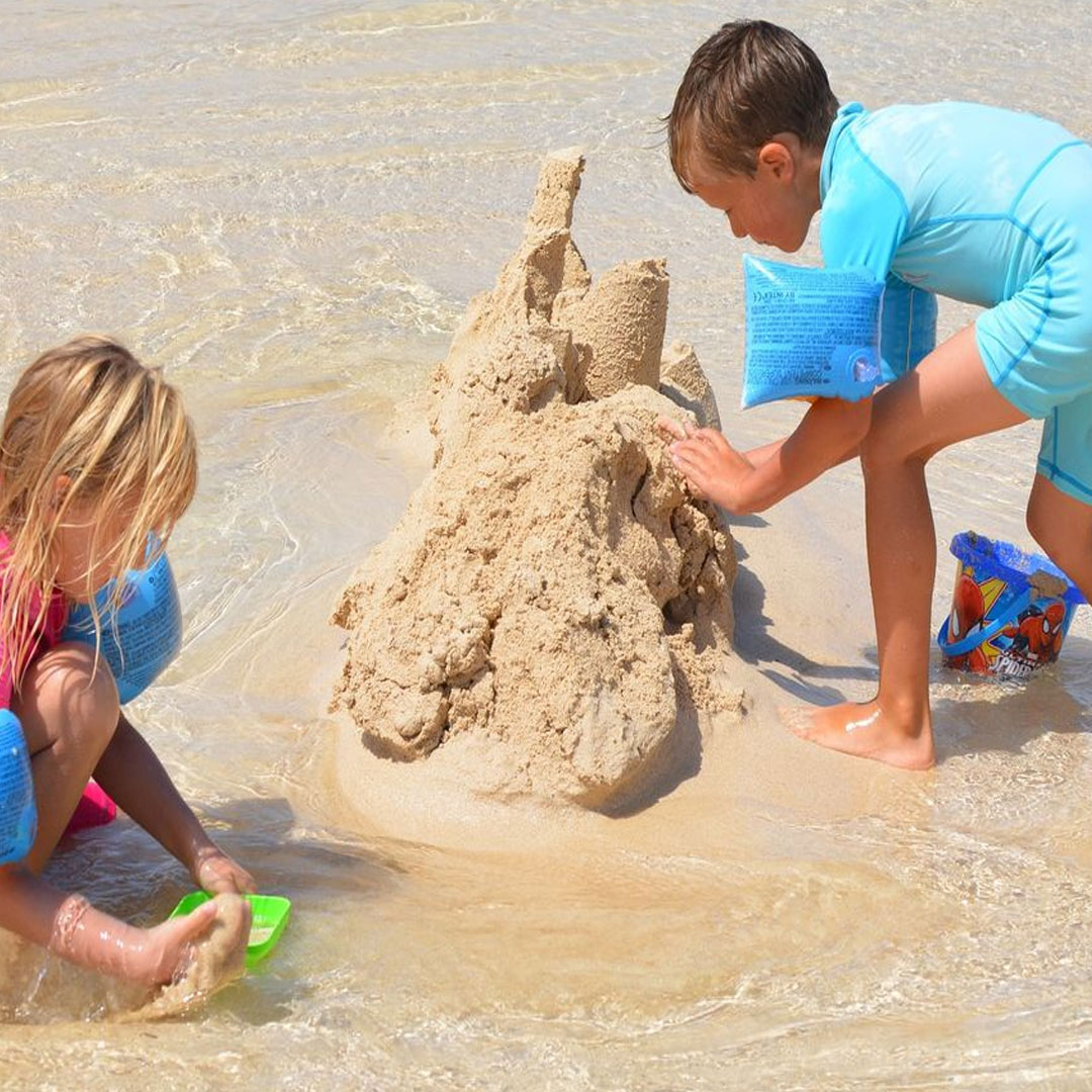 Atau bisa juga memakaikan anak-anak pelampung lengan saat bermain pasir di pinggiran pantai.