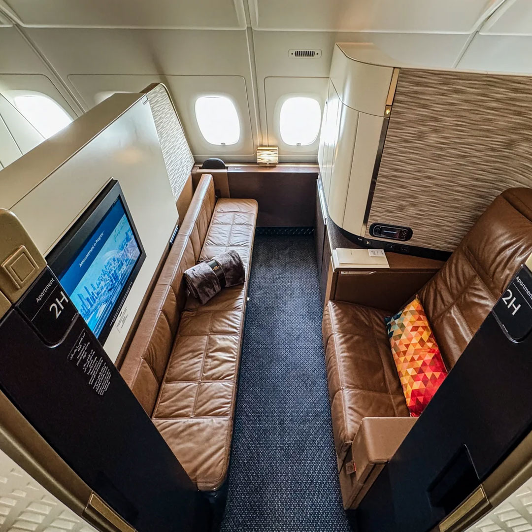 Untuk pertama kalinya, Etihad menghadirkan First Suite lengkap dalam pesawat narrow-body. Hanya tersedia dua suite di setiap pesawat, kabin ini dilengkapi pintu geser, tempat tidur flat, area duduk tambahan untuk tamu, serta layar hiburan 20 inci beresolusi 4K dengan Bluetooth dan wireless charging.