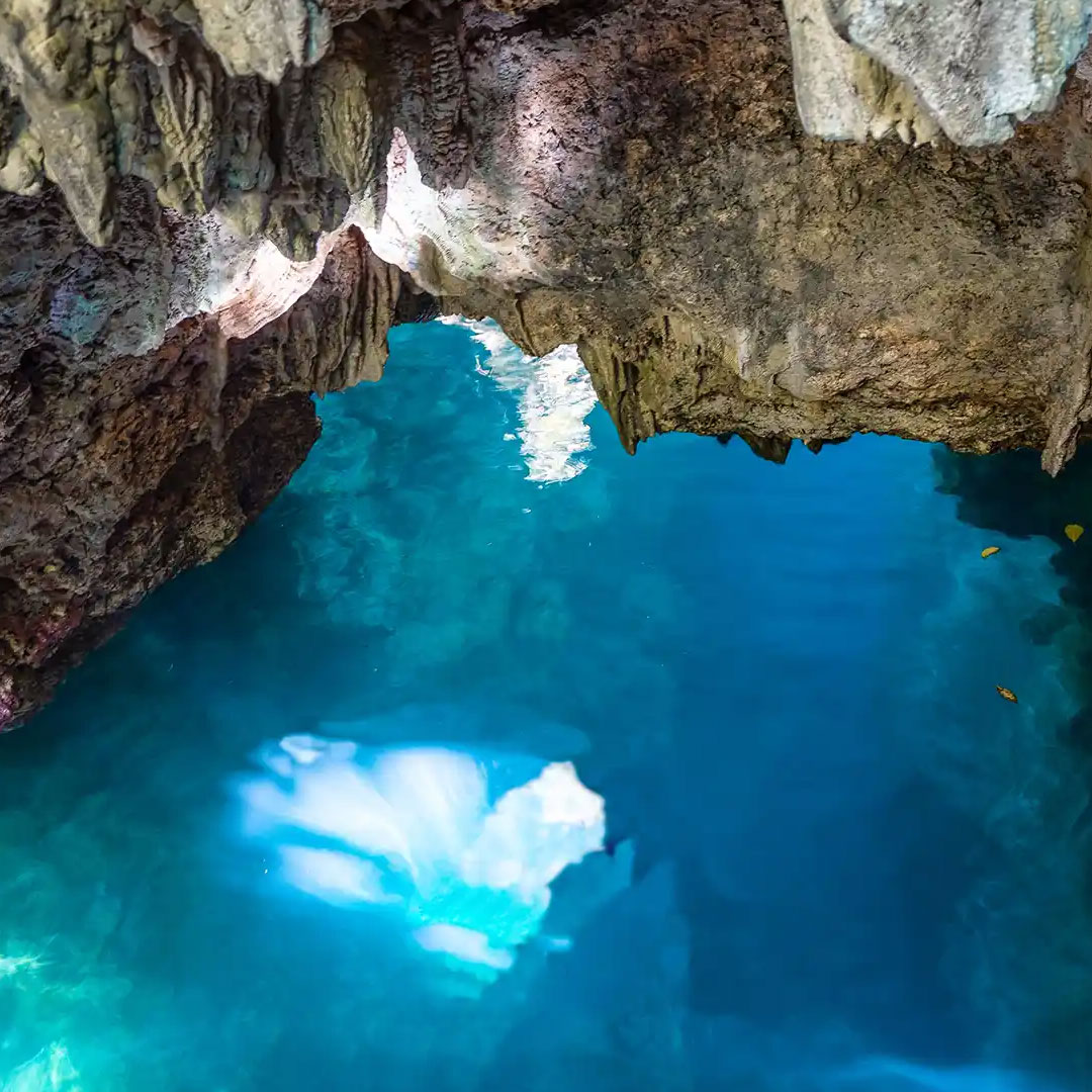 Salah satu hal menarik lainnya adalah bentuk atap gua yang terbelah menjadi dua, membentuk lorong alami yang bisa dilewati saat berada di dalam air.