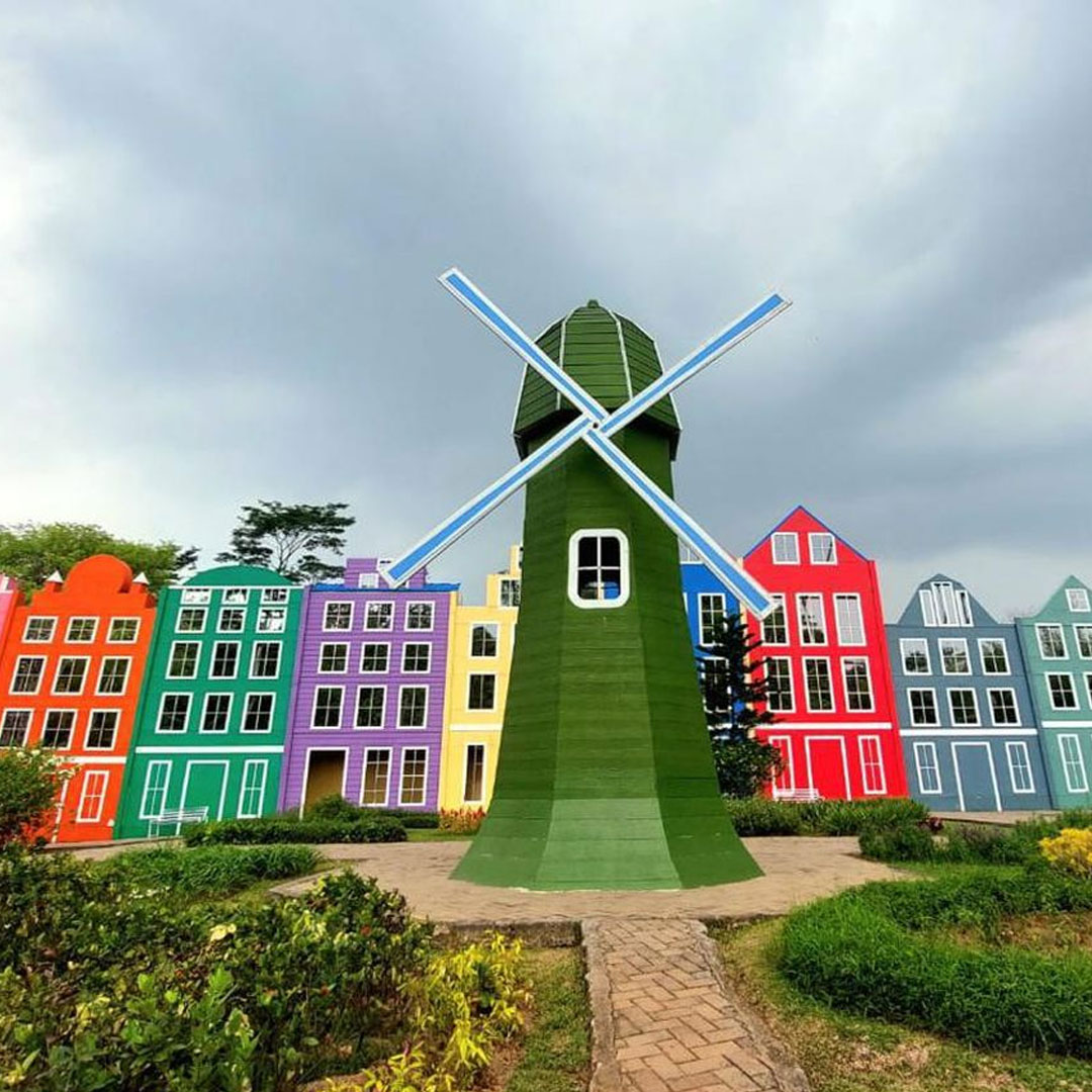 Di area ini, pengunjung akan disambut oleh replika kincir angin bergaya Belanda yang menjulang megah di tengah taman bunga warna-warni.