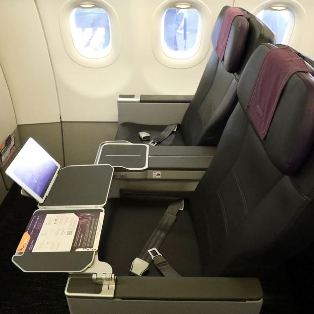 Kelebihannya terdapat pada area pribadi yang lebih luas, serta sandaran kepala dan kaki yang dapat disesuaikan. Selain itu, setiap kursi dilengkapi meja baki lipat, dengan sandaran perangkat pribadi.